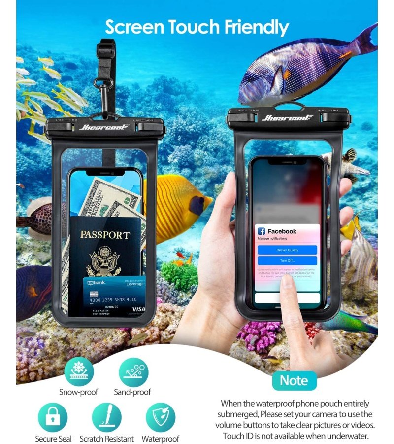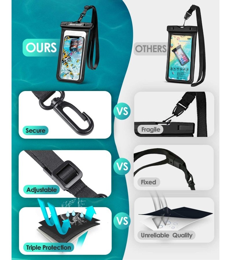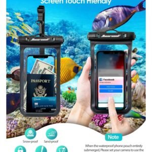 EXTRA LARGER SIZECompatible for all smartphones up to 7.2 inches . such as iPhone 14 13/12 Pro Max.14/13/12/11 Pro.14 Plus.11 Max. 14.13.12.11. Samsung Galaxy S22 S21 Ultra S21+ S21 S20. Google Pixel 6 5.etc. | SENSITIVE SCREEN-TOUCHThis waterproof case features a snap clasp and lock seal system that ensures full protection against even storm. | Fully ProtectionDesigned for underwater. swimmers. surfers and scuba divers. This waterproof bag can not only protect your phone. but also the carry-on passport. cards. or cash. |