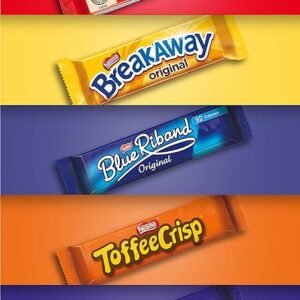 A display-ready presentation box featuring five delicious chocolate biscuits + Includes an assortment of KITKAT, BREAKAWAY, BLUE RIBAND, TOFFEE CRISP and YORKIE BISCUIT chocolate biscuit bars + Suitable for use at any catering or office event + Free from artificial colours, flavours, preservatives or hydrogenated fats and Suitable for vegetarians.